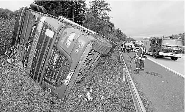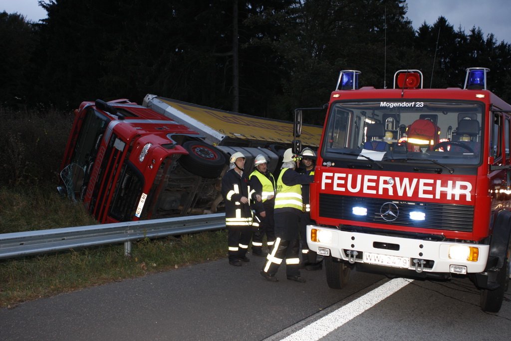 Auf der A 3 in der Nähe des Dernbacher Dreiecks ist am Dienstagabend ein Sattelzug von der Fahrbahn abgekommen und umgekippt. Der Unfall ereignete sich nach Angaben der Autobahnpolizei Montabaur um 18.05 Uhr in Fahrtrichtung Frankfurt. Der Fahrer hatte Glück im Unglück und wurde laut Polizeiangaben nicht verletzt. Zur Bergung des Lastwagens mussten jedoch zeitweise zwei Fahrspuren gesperrt werden. Mehrere Feuerwehren rückten an. Es kam zu Staus auf der A 3 und auf der A 48 in Richtung Frankfurt. Die Unfallursache ist bislang noch unklar. tf Foto: Sascha Ditscher