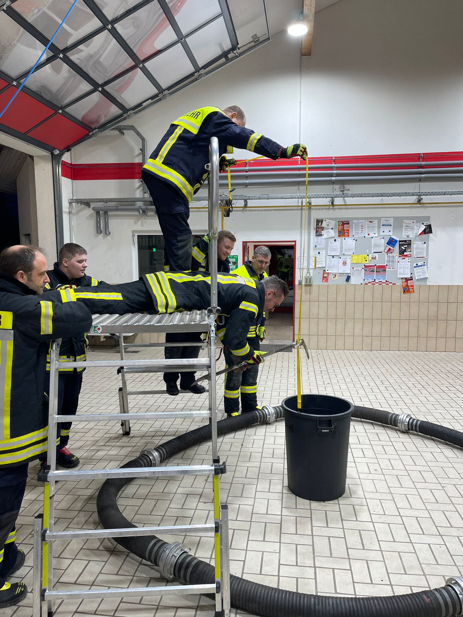 Der letzte Übungsabend stand ganz im Zeichen von kreativen Ideen. So galt es, an verschiedenen Stationen knifflige Aufgaben zu lösen. An der ersten Station wurden die verschiedenen Gruppen vor die Herausforderung gestellt, einen Bierzelttisch mit darauf befindlichen Wasserbechern aufzustellen, ohne direkte Muskelkraft einzusetzen, sowie kein Wasser zu verschütten. An der zweiten Station galt es, einen Wasserkanister aus einem Behälter zu heben, ohne den umliegenden, abgesperrten Bereich zu betreten. An Station 3 mussten verschiedene Dinge mit Hilfe von Schere und Spreizer zwischen zwei Pylonen hin und her transportiert werden. An allen Stationen wurden durch die verschiedenen Gruppen zwar grundsätzlich verschiedene Ansätze erarbeitet und ausprobiert, von diesen war aber jeder einzelne schnell und zielführend. Durch diese Übung wurde nicht nur die Kommunikation im Team sowie die Ideenfreudigkeit verbessert, sondern auch die Kenntnisse im Umgang mit den verschiedenen Geräten sowie der Lagerort im Fahrzeug intensiviert.